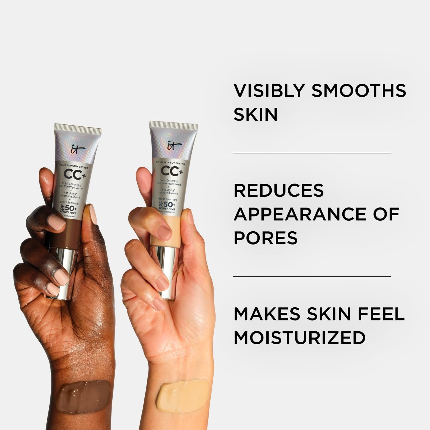 If you desire a radiant glow, then the IT Cosmetics Your Skin But Better CC+ Cream Illumination might be more up your alley. It offers the same color correcting properties, full coverage, hydrating serum, and SPF 50+ as the original CC+ Cream, but with an added luminosity for a radiant finish. Perfect for those days when you want that extra glow.