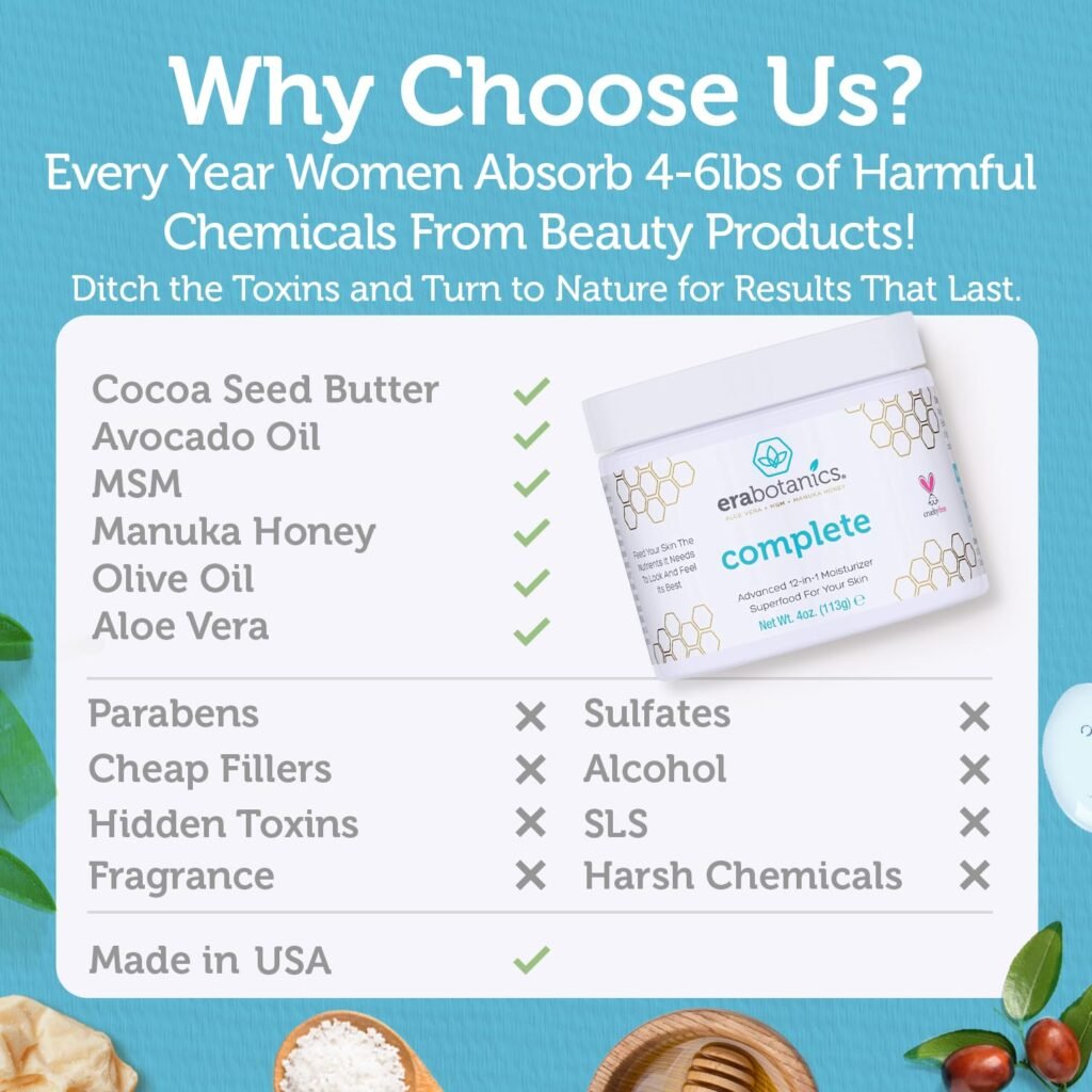 There are several reasons why we like Era Organics Face Moisturizer Cream. Firstly, its 12-in-1 plant-based formula contains a wide range of natural ingredients that provide the skin with essential vitamins, minerals, and amino acids. This superfood complex includes organic Aloe Vera, Manuka Honey, MSM, Coconut Oil, Shea Butter, Blue Green Algae, Olive Oils, Cocoa Butter, and more. These nutrient-rich ingredients work together to nourish and replenish the skin, giving it a radiant and youthful glow.